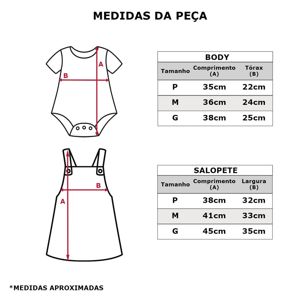 Composição: Body 96% algodão e 4% elastano / Salopete 48% viscose, 20% algodão, 20% poliéster, 9% linho e 3% elastano.