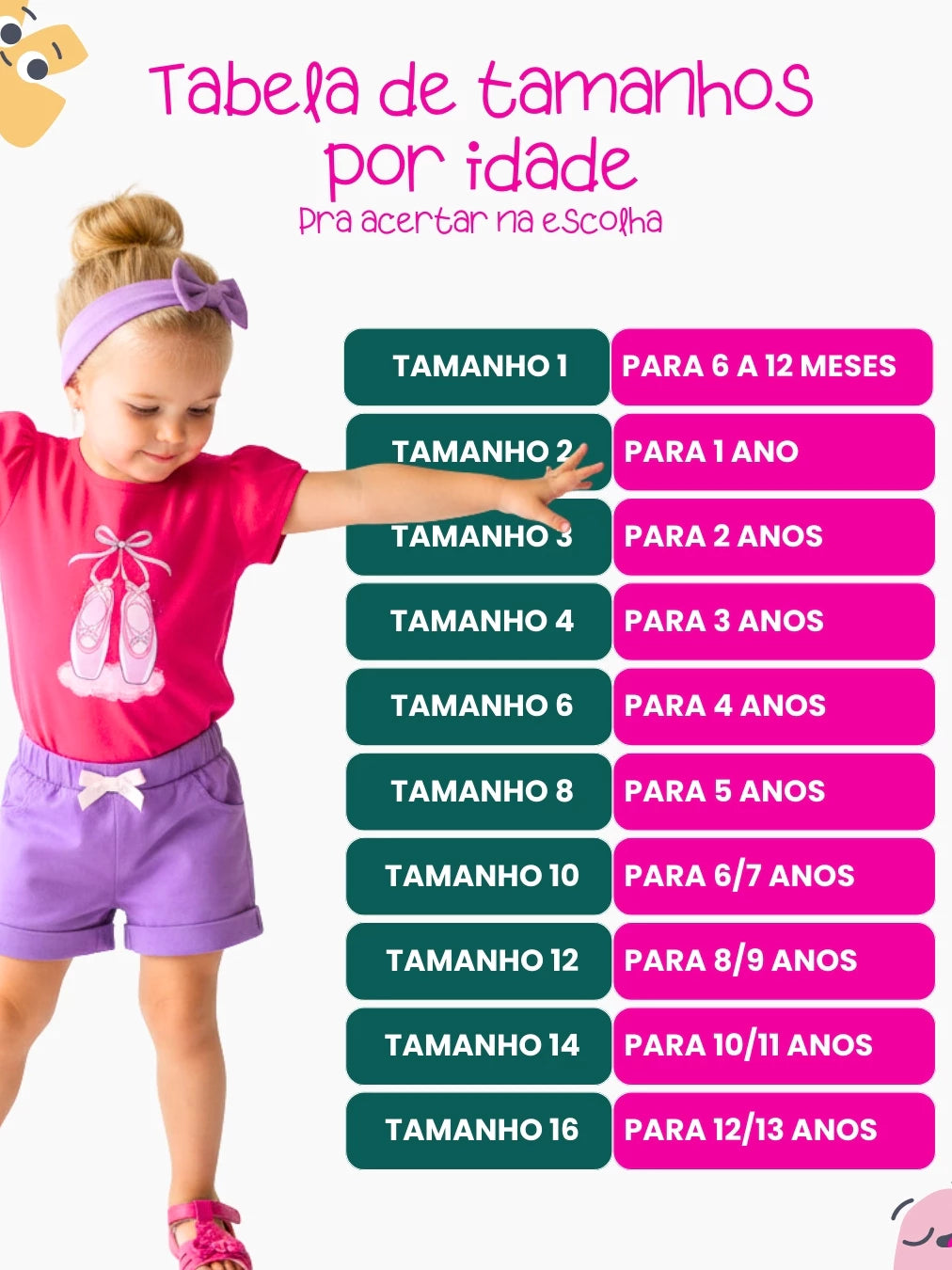 Tamanhos: Disponível do 1 ao 14, para acompanhar o crescimento da sua filha.