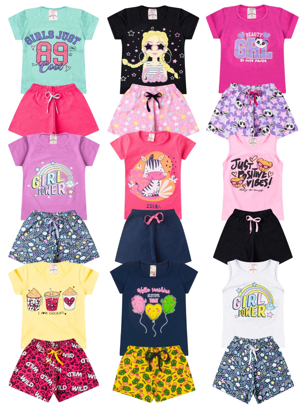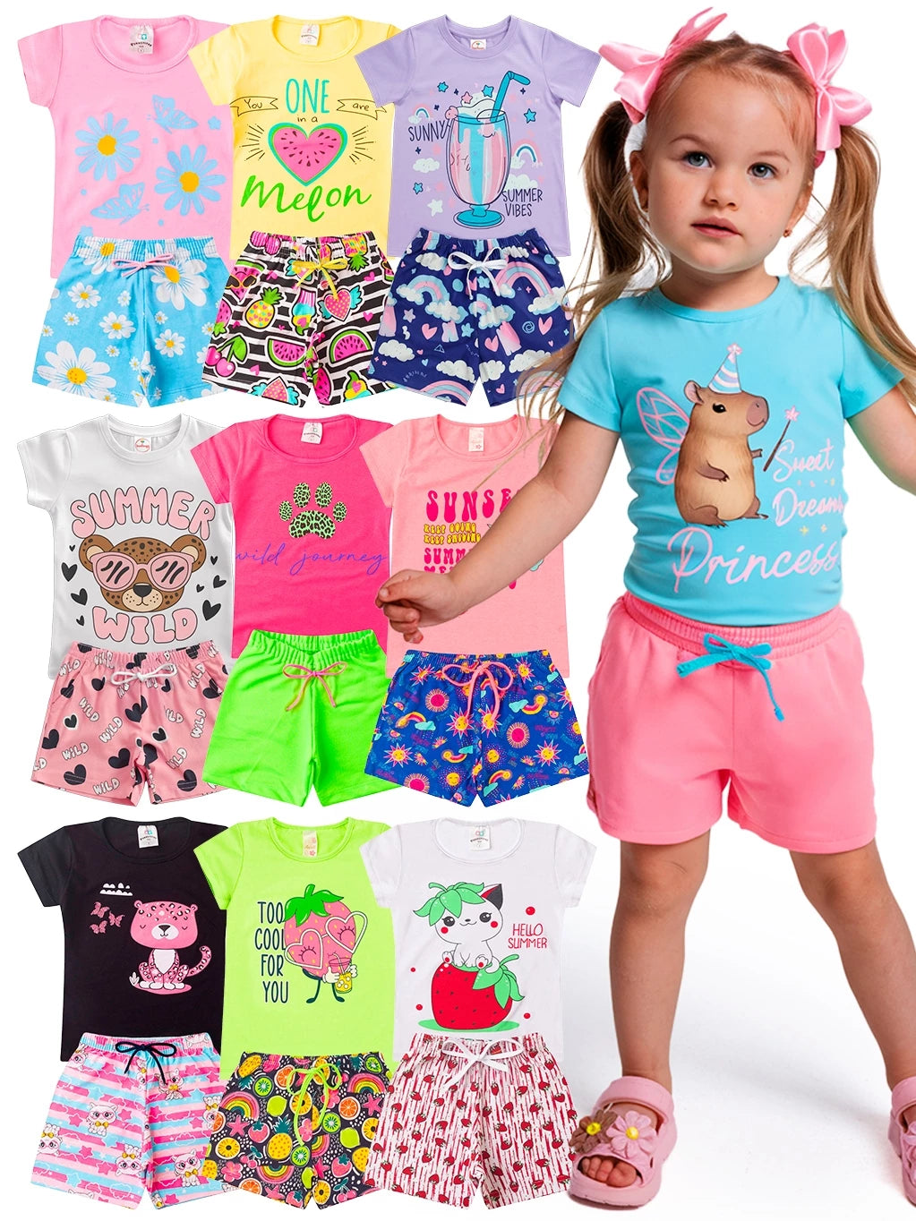 5 Camisetas e 5 Shorts Kit 5 Conjunto de Roupa Infantil Feminina Verão: