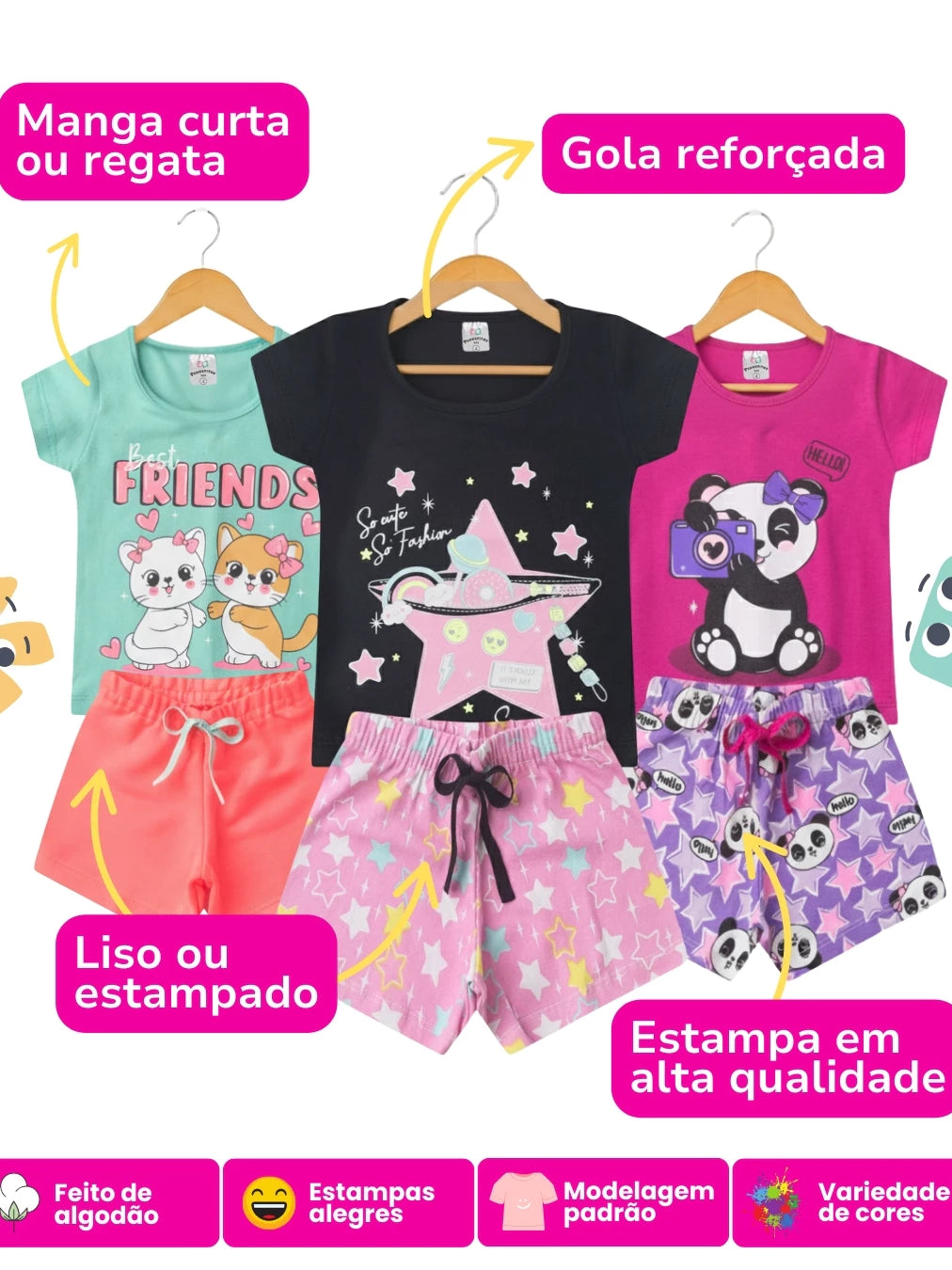 Estampas e cores: As peças possuem estampas variadas e cores vibrantes, perfeitas para a personalidade alegre das meninas.