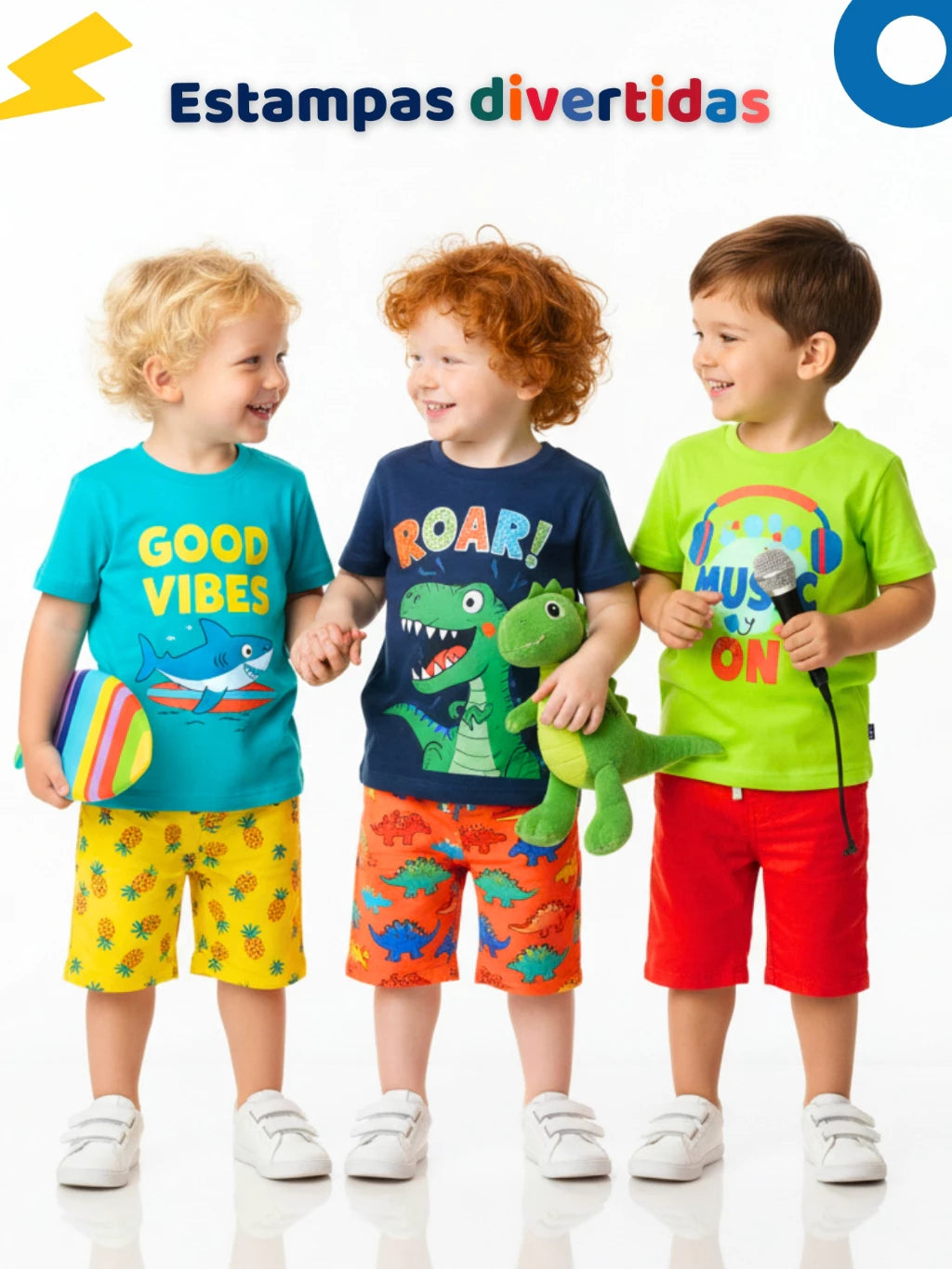 Shorts com no mínimo 85% algodão – resistentes, confortáveis e ideais para brincadeiras.